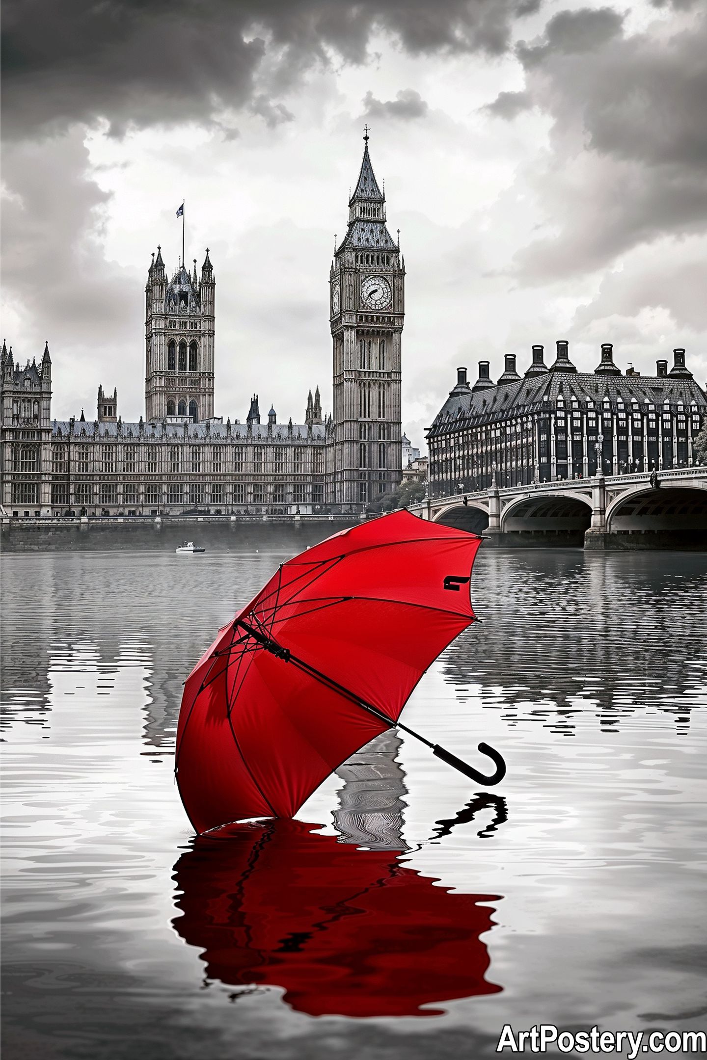 Whether you are looking for unique decor to elevate your living area or searching for the perfect gift, this item stands out as a top choice among cool posters available today. Our image captures the iconic Big Ben and the Palace of Westminster under dramatic skies, punctuated by a vibrant red umbrella floating on the Thames—a truly eye-opening composition.