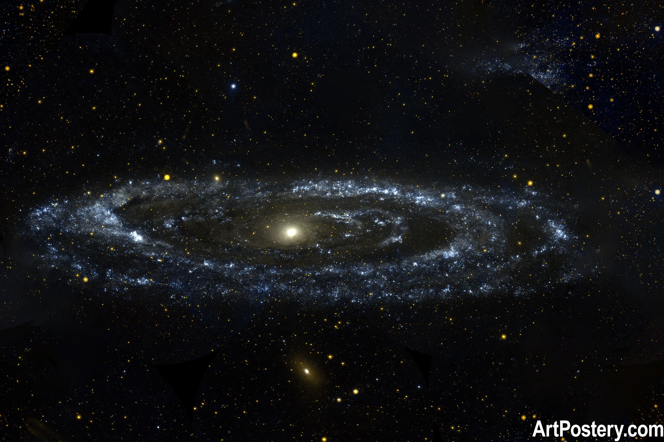This poster reveals a vast spiral galaxy floating in a deep black universe, where countless tiny stars shimmer like scattered gold dust. At the center, a bright luminous core softly radiates outward, drawing the eye into the swirling arms of the galaxy.