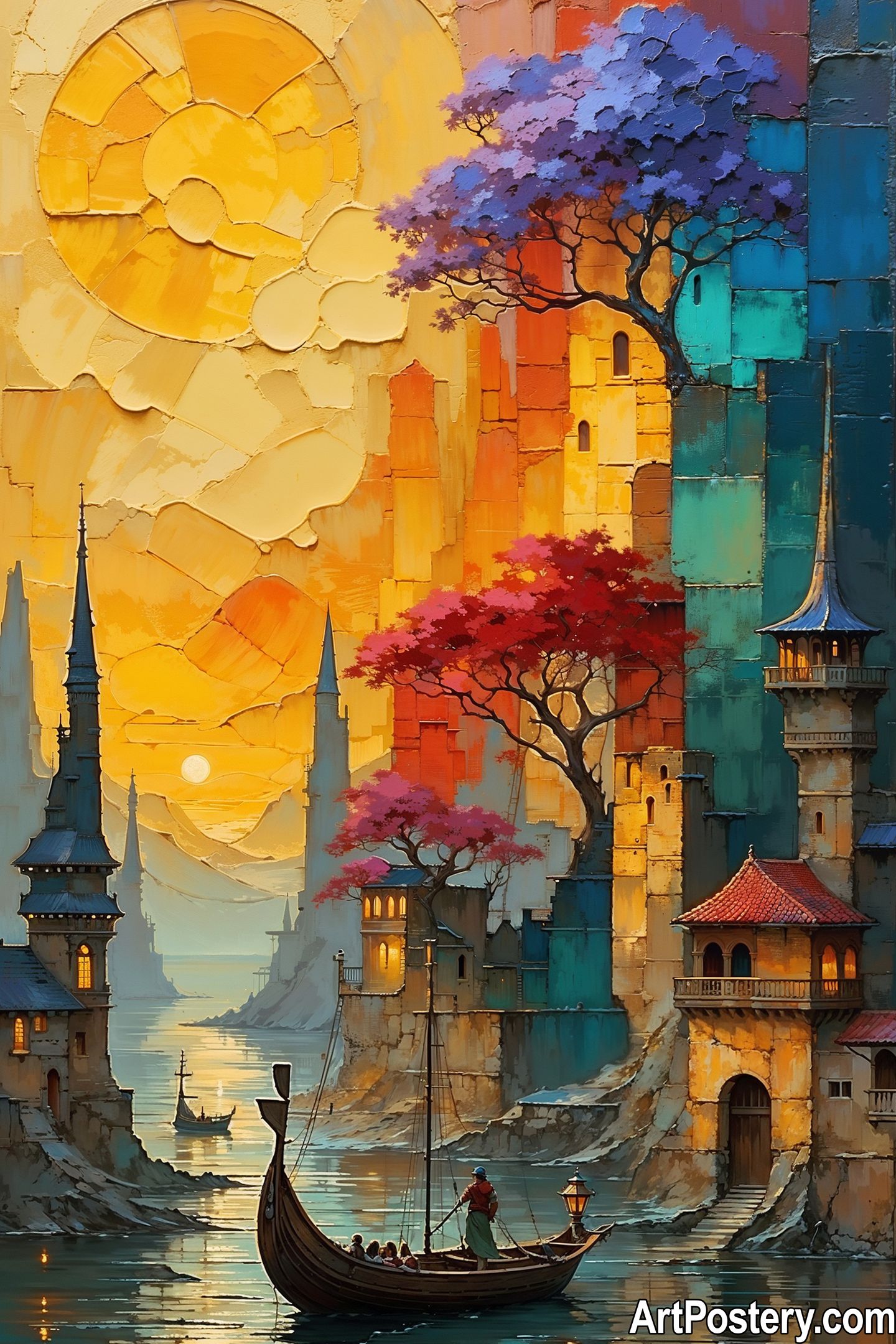 The image depicts a breathtaking, vibrant fantasy landscape bathed in golden light. The scene features towering spires and ancient-looking structures built into rocky cliffs overlooking a calm body of water. A striking contrast is created by trees with vivid purple, blue, and red foliage against the warm tones of the sky and buildings. In the foreground, a wooden boat carrying passengers navigates the water, guided by a figure standing at the stern. The atmosphere is serene yet magical, blending architectural grandeur with natural beauty in an ethereal composition.
